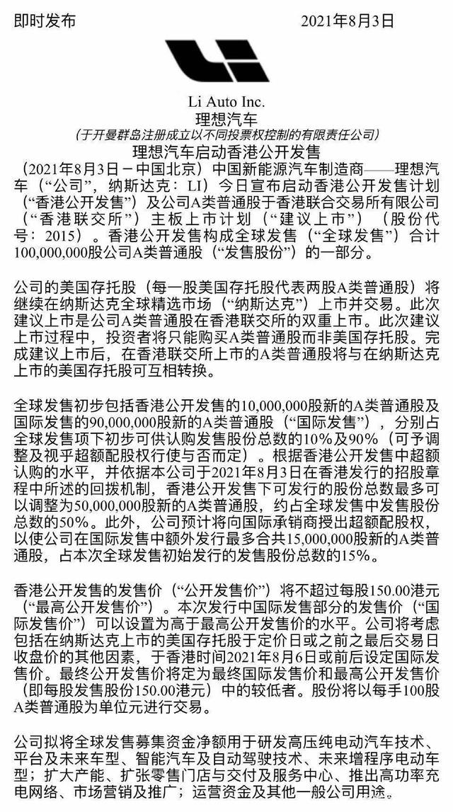 近日,港交所公开信息显示,理想汽车-W将于2021年8月12日正式在港上市,并计划通过香港IPO发行1亿股股票,最高发行价为每股150港元。
