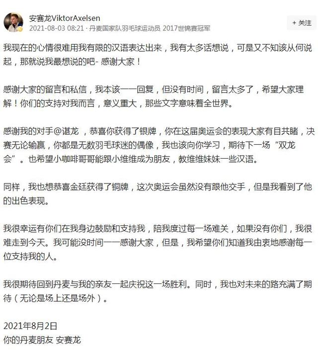 8月3日,在东京奥运会羽毛球男单决赛中战胜中国选手谌龙的丹麦选手安赛龙,在中国社交媒体用中文发文: