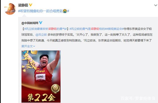 好在巩立姣就是一个不服输的女孩,她重新调整心态,投入到训练。每次遇到困难挫折时,就会听梁静茹的《勇气》。最终巩立姣在东京奥运会上成功圆梦,拿到了金牌。让巩立姣感到意外之喜的是,她的赛后感言引起了天后梁静茹注意。