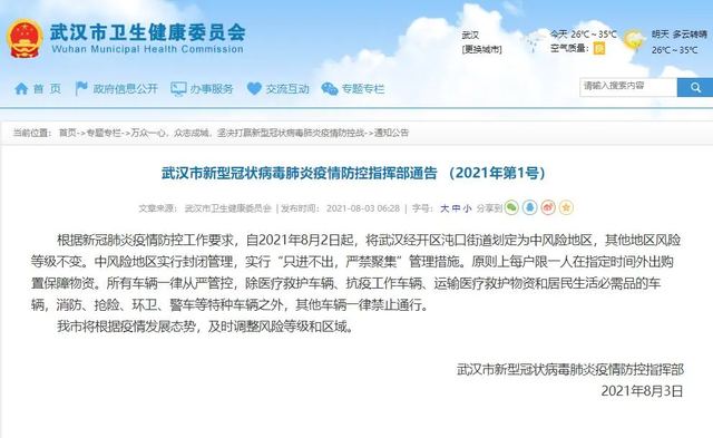 另据“武汉发布”微信公众号8月3日消息,武汉市新型冠状病毒肺炎疫情防控指挥部发布2021年第1号通告:根据新冠肺炎疫情防控工作要求,自2021年8月2日起,将武汉经开区沌口街道划定为中风险地区,其他地区风险等级不变。
