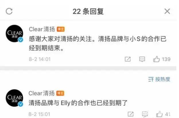清扬洗发水就率先发表声明:小S和其女儿的合约已经到期。跟小S合作多年的某食品品牌也发表声明,正式提出解约。