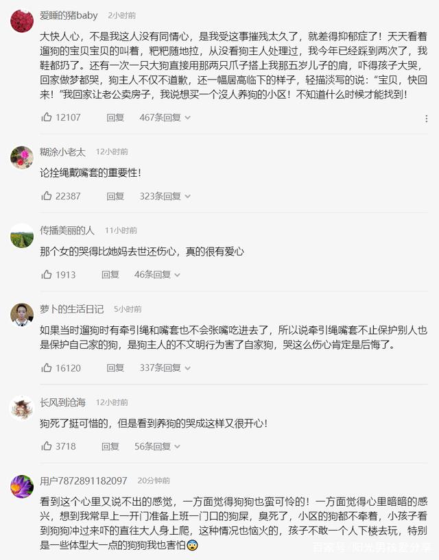 同样此次事件却在网络上引发了众多网友的叫好,有网友表示:真是大快人心,不是我没有同情心,是我受这事摧残太久了,都快得抑郁症了!天天看着遛狗的宝贝宝贝地叫着,粑粑随地拉,从没看狗主人处理过,我今年已经踩到两次了,我鞋都扔了。还有一次一只大狗直接用那两只爪子搭上我那五岁儿子的肩,吓得孩子大哭,回家做梦都哭,狗主人不仅不道歉,还一副居高临下的样子,轻描淡写地说:“宝贝,快回来!”我回家让老公卖房子,我说想买一个没人养狗的小区!不知道什么时候才能找到!也有网友表示:论拴绳嘴套的重要性!还有网友表示;狗死了挺可惜的,但是看到养狗的哭成这样又很开心!