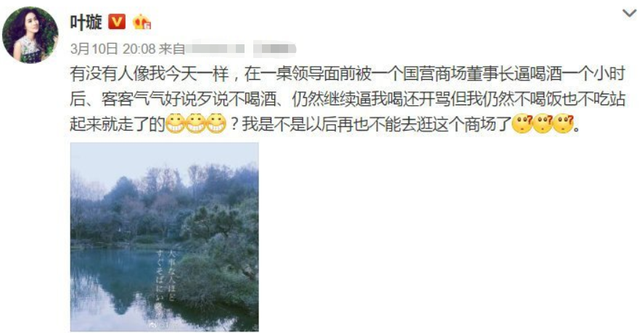 叶璇向来是大胆发言,曾经还发文控诉自己在饭局遭遇“潜规则”,近年来也经常录制视频谈论圈内事。