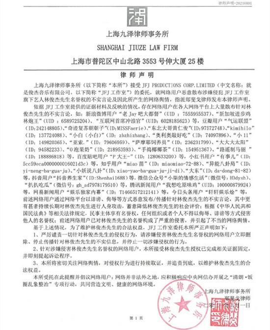 2021年8月1日晚,林俊杰公司委托律师事务所发表声明,表示网络用户在各大网络平台上散布针对林俊杰的不实言论,公司要求停止一切涉嫌侵权的行为,针对涉侵权用户已完成相关证据固定,并即刻提起诉讼程序。工作室将对侵权行为进行持续取证,并追责到底,维护林俊杰的合法权益。