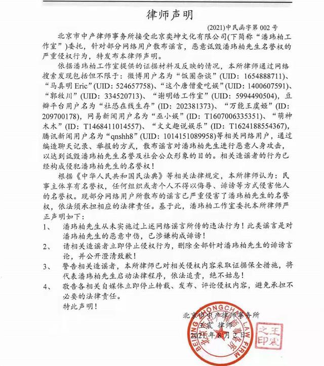 声明中表示:潘玮柏从未实施过网络谣言所传的违法行为,要求相关造谣者立即停止造谣,删除全部诽谤言论并公开澄清致歉,且表示会依法追责绝不姑息。潘玮柏工作室随后转发称:“网络并非法外之地,每个人都要为自己的言论负责。针对网络上对潘玮柏先生的一切不实言论,我们将坚决维权,并追责到底。”