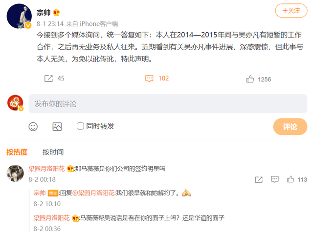 同时,宗帅还表示:“近期看到有关吴亦凡事件进展,深感震惊,但此事与本人无关,为免以讹传讹,特此声明。”并在评论中回应网友称很早就和马薇薇解约了,怪不得马薇薇曾经力挺吴亦凡,原来他们曾是同事关系。如今,马薇薇遭到报应了,被微博封号了,她本人也发表道歉声明,表示要暂退娱乐圈。