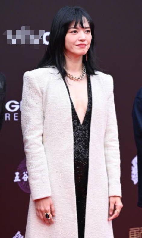 她当天穿着黑色深V黑色礼裙搭配白大衣,又飒又美气场强大,身高在一众男性里也不落后,比例优越很吸睛。