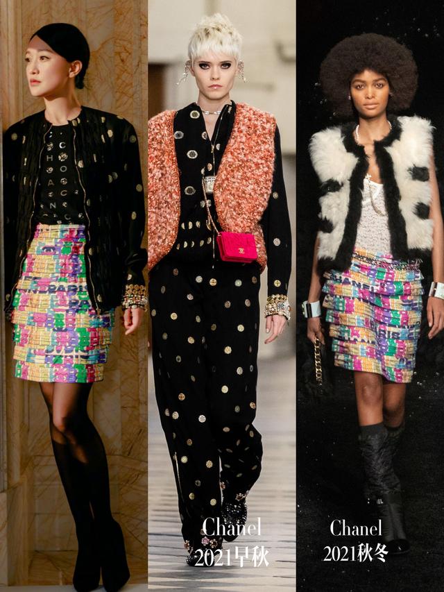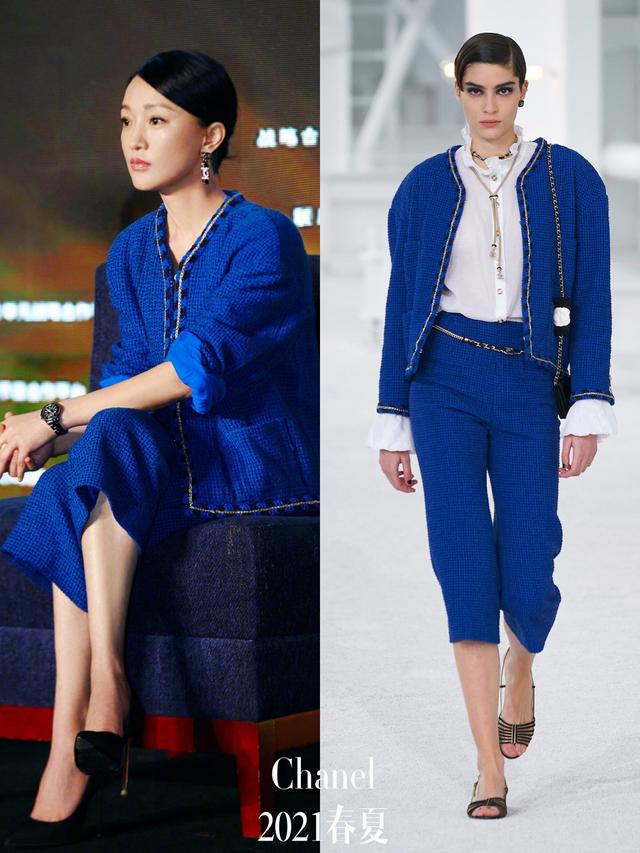 电光蓝这套造型来自香奈儿2021春夏,颜色明亮提气色,经典的粗呢款式端庄有气场,符合她评委的身份。
