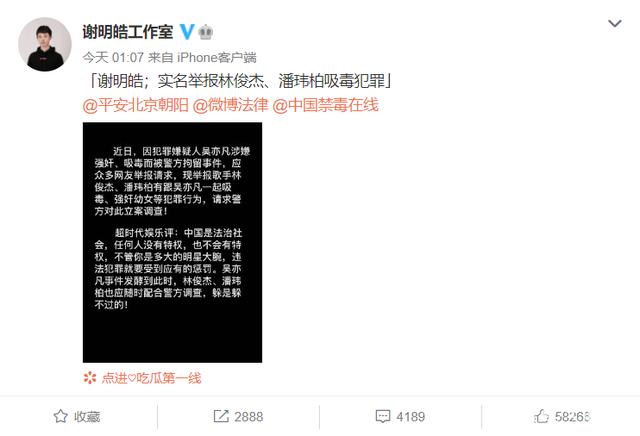 不仅如此,还有一位名叫谢明皓的男艺人也以自己工作室的名义大胆放出爆料,欲锤林俊杰和潘玮柏二人的各种违法犯罪行径,并且艾特了相关官博账号,希望他们能够对自己的言论进行正式。