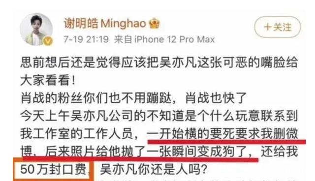 据悉,谢明皓是娱乐圈中没什么知名度的一位歌手,早在7月18日的时候就举报说肖战给吴亦凡介绍18岁的姑娘,并且还给自己50w封口费,还晒出有关的聊天截图作为辅助证据。
