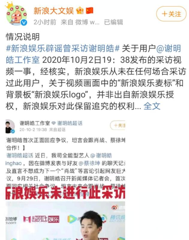 昨天,新浪娱乐发声,称从未采访过谢明皓,他上传视频里的新浪娱乐logo完全是假的,具体内容如下: