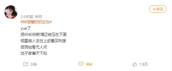最近因为河南大雨、东京奥运会几大热点事件,热搜榜上的娱乐新闻较少。不少网友表示这才是正常的热搜也是大家所想看到的热搜,但是就在不久前钟楚曦奶奶去世登上热搜却引来了不少网友的吐槽和评判。