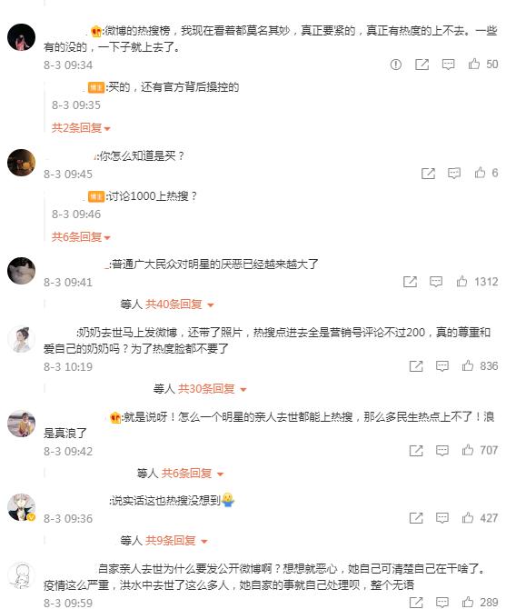 原因就是网友们认为在国家大事比较重要的时候,钟楚曦奶奶登上热搜时机不合适。而且这条热搜的讨论度仅为1000条,这个讨论的热度完全不值得排在热搜第六的位置。不少网友都质疑这个热搜是钟楚曦自己炒作的,有的网友表示亲人去世本来就是件悲痛的是钟楚曦竟然还有时间想着发博文,这不就是在故意炒作吗?