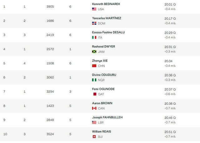 美国选手展现强大实力,贝德纳雷克20秒01排名第一,诺亚-莱尔斯20秒18第三,多米尼加的马丁内斯20秒17第二。美国17岁的新人奈顿,在所在小组跑出第一,也轻松进入半决赛。
