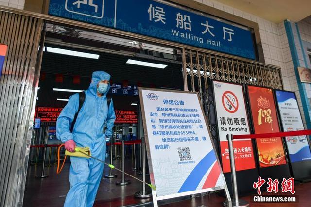 本文转自【中国新闻网】; 8月3日,一位防疫工作人员在海口港候船大厅入口进行消杀作业。因受热带低压影响,琼州海峡风力增大,琼州海峡航线于当日2时起全线停运。 中新社记者 骆云飞 摄