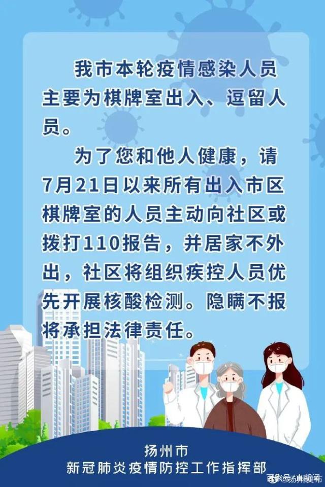 自7月28日以来,扬州主城区范围内的娱乐场所、室内文化体育场所、培训机构、托育机构、室内宗教场所、洗浴中心等一律暂停开放。扬州市也已发布通知,要求自7月21日以来出入市区棋牌室的人员主动申报,并居家不外出。