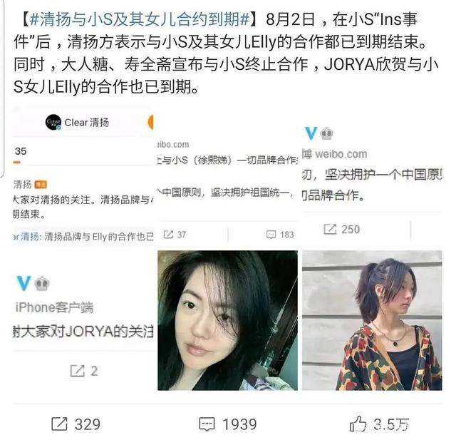小S因为是社交平台发了不当言论,引起了很多网友的不满,紧接着她和女儿在内地的四个品牌代言也相继宣布解约和合作到期。