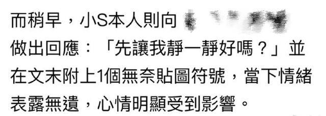 据悉,小S本人做出的回应是说了一句“先让我静一静好吗?”,并且附上一个表示无奈的表情符号,可以猜测,小S的心情明显受到不小影响。
