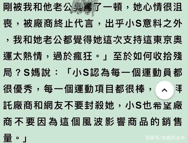 据相关报道,之后小S的妈妈在接受采访中透露,因为这件事,小S在家里已经被自己老公和妈妈臭骂了一顿,她自己的心情也很沮丧,因为被终止代言是出乎她意料之外的事情。另外,小S妈妈还说小S认为每一个运动员都是很棒的,最后拜托厂商和网友不要封杀小S。