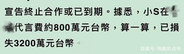 据悉,小S在内地的代言费大概在800万台币左右,这次一连失去了4个代言,预估小S和女儿一共会损失3200万台币的收入。