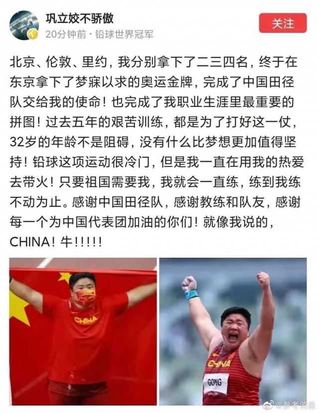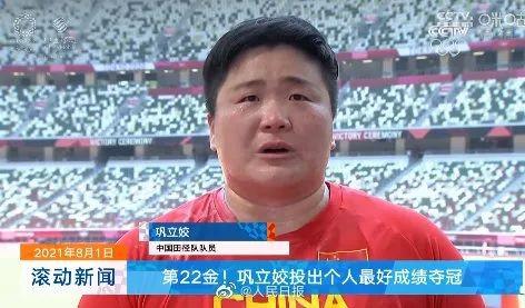 比赛结束后,面对镜头,巩立姣大声喊出“中国,牛!”四战奥运会,这次她圆梦成功。