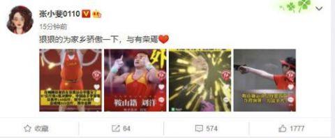 8月3日,张小斐在社交平台发布一则动态,夸赞自己家乡的奥运健儿:“狠狠的为家乡骄傲一下,与有荣焉”。