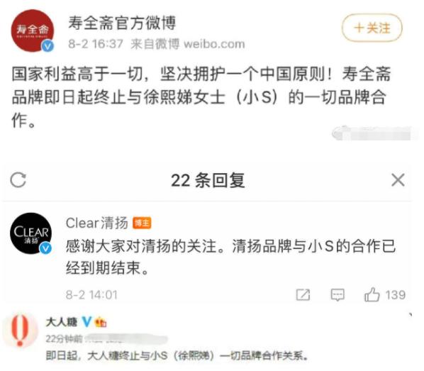 8月2日小S在外网社交平台发表的“国手”言论引发争议并且迅速上了热搜,惹来网友的抵制和吐槽,被质疑她是“双面人”,这让小S在大陆网友心中的形象迅速下跌,并且很快,品牌商家的“回应”就来了。