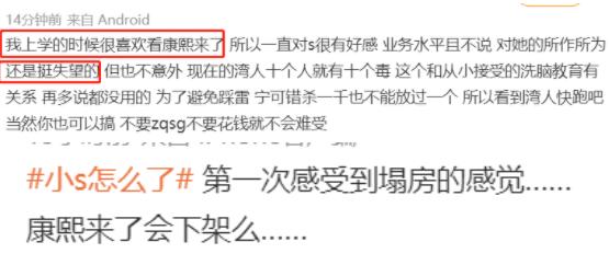 而这次小s言论翻车,虽然是自作自受,如今被网友回想起来,或许也受过蔡康永不少的影响。希望小S这次能够坚定地站出来公开表明自己的立场,并以实际行动证明。观众们再爱《康熙来了》,也不会超过对国家的爱,更容不下“阴阳人”和“两面派”。