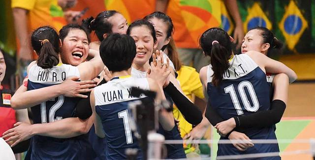 2016年8月17日,里约奥运会女排1/4决赛,中国女排战胜巴西队后庆祝。(中国体育图片供图)