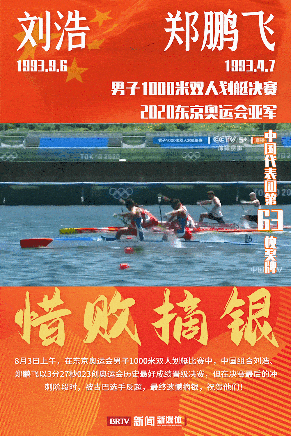 8月3日上午,在东京奥运会男子1000米双人划艇比赛中,中国组合刘浩/郑鹏飞在决赛最后的冲刺阶段被古巴选手反超,最终以3分25秒198的成绩遗憾获银,为中国代表团再添一枚奖牌!