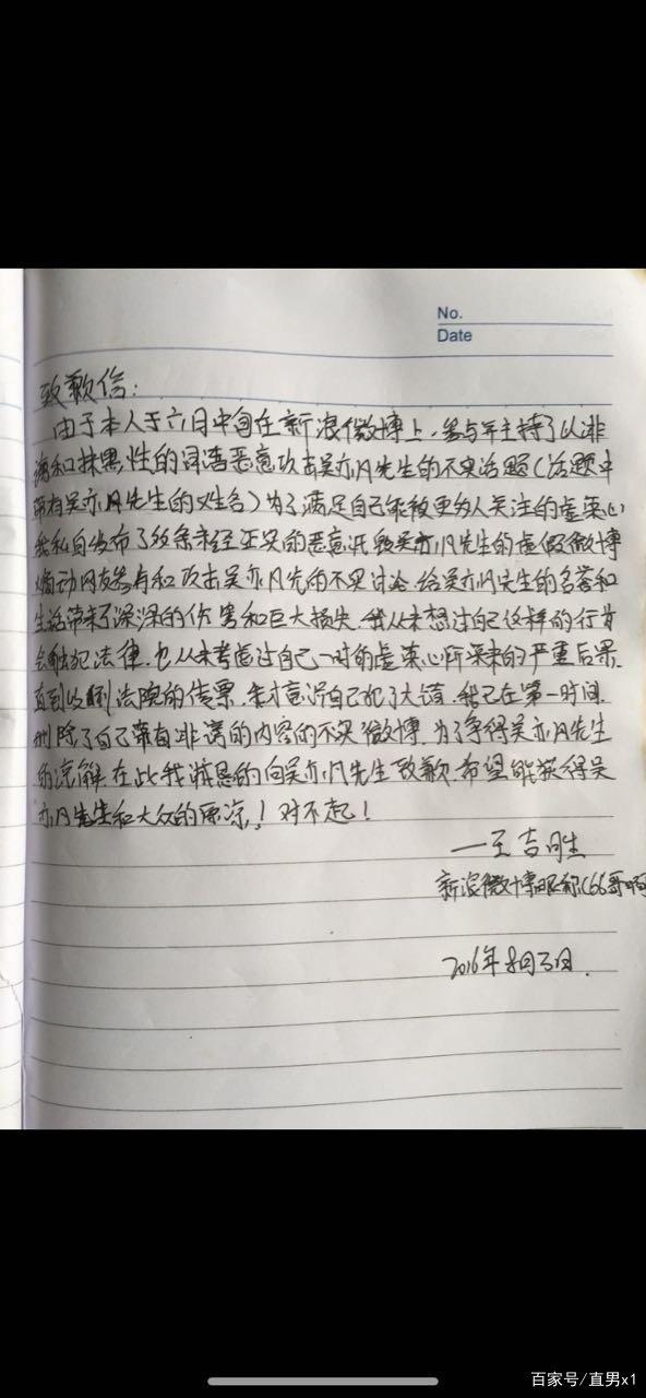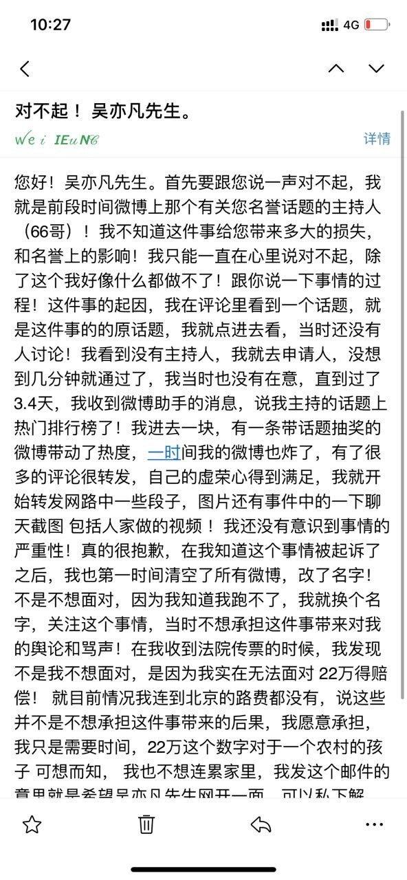 5年前因在“小G娜”事件中任“吴亦凡炮王”超话主持人以及骂吴亦凡“炮王"等被吴亦凡方起诉,要求其赔偿经济损失12万元,精神损害抚慰金10万元,共22万。 小伙给吴亦凡发邮件,请求网开一面,自己无法承担22万罚款。最终法院判决公开致歉15日,赔偿3.65万元。