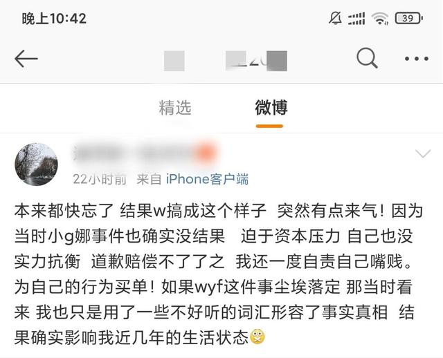 近日,小伙发微博回应:本来都快忘了 ,结果w搞成这个样子 突然有点来气!因为当时小g娜事件也确实没结果 迫于资本压力, 自己也没实力抗衡 道歉赔偿不了了之 我还一度自责自己嘴贱。为自己的行为买单!如果wyf这件事尘埃落定 那当时看来 我也只是用了一些不好听的词汇形容了事实真相 结果确实影响我近几年的生活状态。