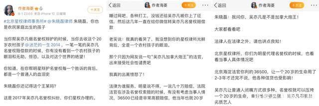 朱晓磊,你也是农民家庭出生的孩子。当你帮吴亦凡做名誉权辩护的时候,当你去收这个20岁农村孩子一笔一笔的吴亦凡名誉权赔偿款的时候,你有没有看到一个农村孩子的眼泪和无助,惊恐,以及对这个世界的绝望?你知道,在你帮明星辩护名誉权的每一个胜诉的背后,都是一个普通人的血泪史!朱晓磊你还记得这个王某吗?