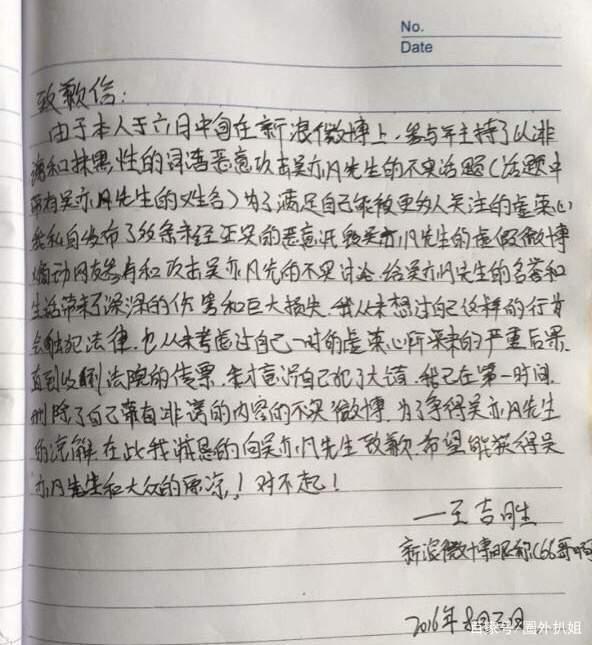 战战兢兢、如履薄冰、如临深渊、如临大敌的王吉胜,只得再写一封道歉信向吴亦凡道歉。