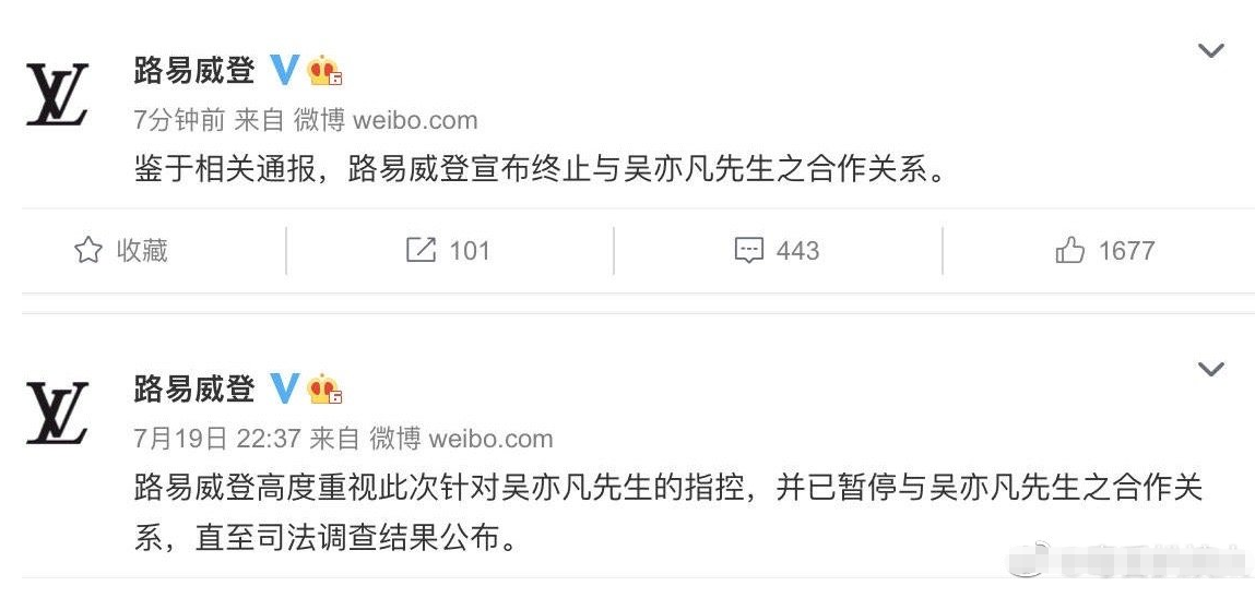 再看其他几个品牌,相比起来求生欲就有点低了,甚至还有一个奢牌一开始只是暂停合作,后面等到官方通报出来才宣布停止合作,但也无法挽回网友了,品牌形象大打折扣。