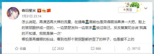 除此之外,一位名叫「春日星火」的网友,先是在微博上转发北京朝阳分局的刑拘公告,并表示「不只强奸罪,等着吧」。之后更爆料在逮捕当下,吴亦凡是在缉毒警察面前「哭得眼泪鼻涕一大把,脸上的玻尿酸挤成一团的,一边瑟瑟发抖一边哀求放过自己」,同时也表示当下吴亦凡是反反覆覆叨念「我真的不知道,我就是第一次」,再加上内地公安部禁毒局也转载了北京朝阳分局的刑拘公告,这也让不少网友推测,吴亦凡除了涉及强奸罪外,可能也涉及使用毒品。