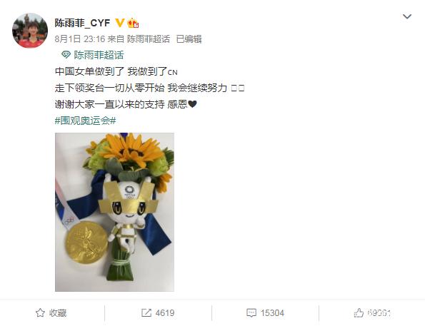 陈雨菲在夺冠后发微博晒出自己的金牌,并感谢大家一直对她的支持:“中国女单做到了,我做到了,走下领奖台一切从零 开始,我会继续努力,谢谢大家一直以来的支持,感恩”。