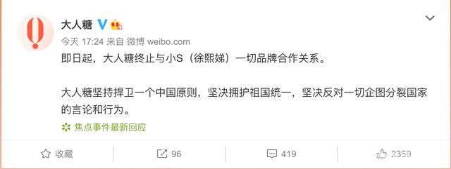 同时,大人糖、寿全斋宣布与小S终止合作,JORYA欣贺与小S女儿Elly的合作也已到期。