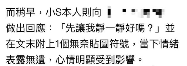 8月2日晚,小S向台媒回应ins风波:“先让我静一静好吗?”同时,台媒称小S的心情明显受到了影响。