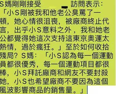 小S妈妈目前也接受了台媒采访,她称:“小S刚被我和他老公臭骂了一顿,她心情很沮丧。”对于品牌方解约一事,小S觉得出乎自己的预料,并希望不要因为此次风波影响到销售量,还拜托厂商和网友不要封杀她。