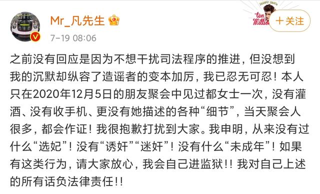 此前,一名19岁的女生在个人微博控诉知名男星吴亦凡通过诸类手段物色、诱骗年轻女性,并与之发生X关系,甚至包括未成年人。随后,吴亦凡及工作室发布了澄清声明,其本人还表示“如果有这类行为,请大家放心,我会自己进监狱”。