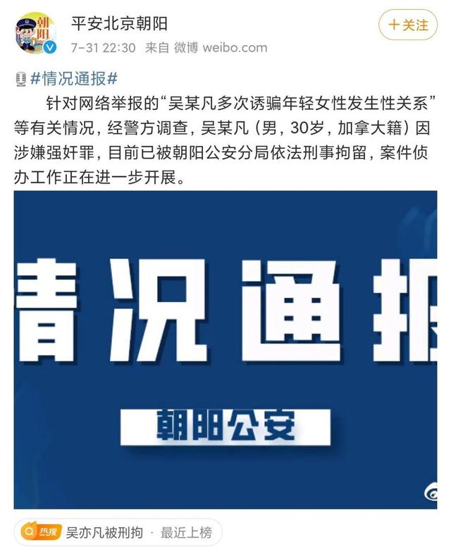 如今,吴亦凡事件又有了新进展,而此次已不同于之前吃瓜爆料的性质:根据7月31日晚北京朝阳警方发布的情况通报,吴亦凡因涉嫌强奸罪,目前已被朝阳公安分局依法刑事拘留。该消息一经发布便引爆了全网,事态影响再度扩大。