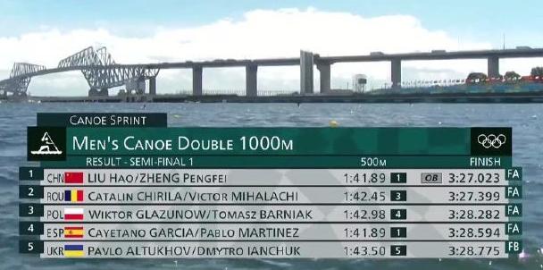 虽然中国组合破了奥运会纪录,但是他们半决赛成绩并非第一,德国组合成绩更快一点,决赛中,刘浩/郑鹏飞将在第5道出发。