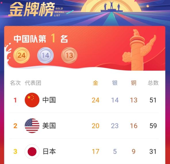 在历经九个比赛日的角逐以后,日本东京奥运会奖牌榜也是再度升级,中国奥运代表团以24金14银13铜的总成绩金牌榜第一,美国队以20金23银14铜的总成绩金牌榜第二,主办国日本队以17金5银9铜的总成绩第三,澳洲以14仅3银14铜的总成绩第四,乌克兰奥委会以12金19银13铜排行第五,美国、荷兰、韩、西班牙、西班牙排序金牌榜第六到第十。