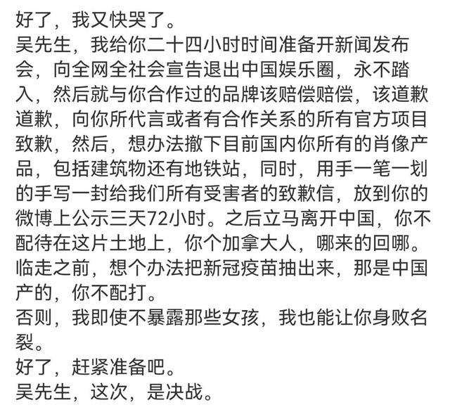 徐某给都美竹写的一些文章确实有一定煽动性,尤其最后一篇:这是决战。里面向吴亦凡喊话,要求吴亦凡退出娱乐圈,跟代言品牌赔偿、道歉,给所有受害者道歉……
