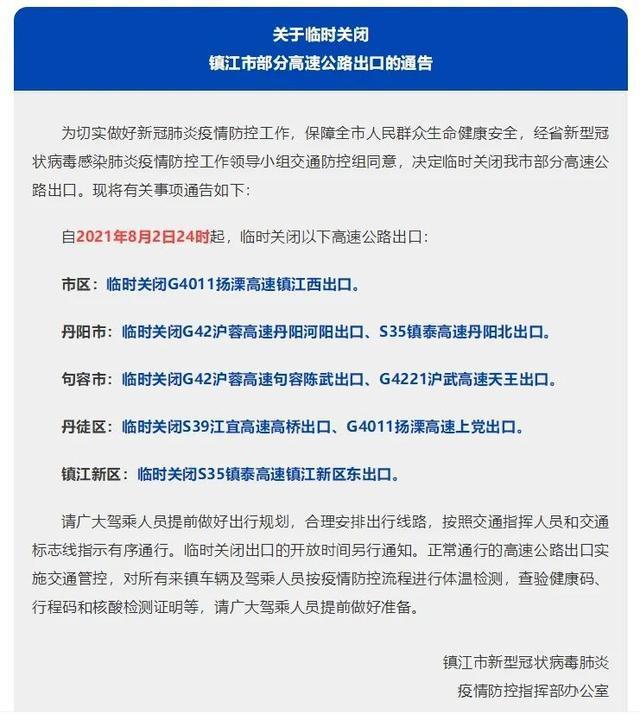 8月3日0时起,镇江市临时关闭8个高速公路出口。