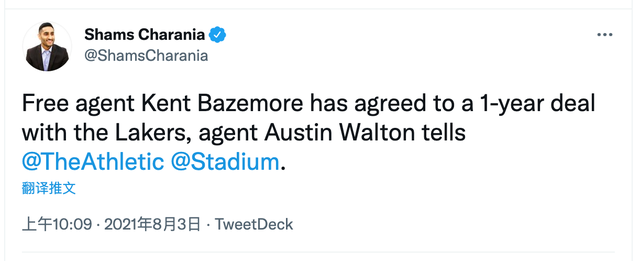 不仅如此,据美媒沙姆斯-查拉尼亚的说法,肯特-贝兹莫尔也与这支湖人签下为期一年的合同:
