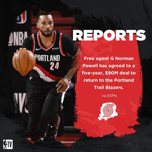 据名记WOJ报道,诺曼鲍威尔5年9000万回归开拓者,这是一份全额保障合同,没有球员选项。
