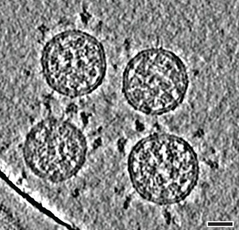 新冠病毒颗粒的冷冻电镜断层扫描成像。(比例尺30纳米。)来源:B. Turoňová et al./Science