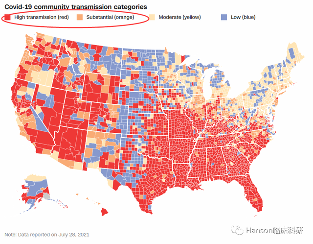 (新冠病毒在美国社区的传染情况,红色-高传播、橙色-大量传染)